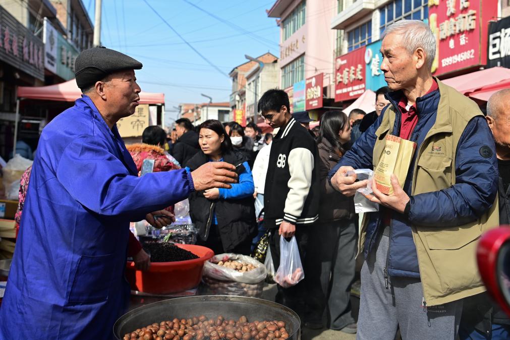 2月13日,一名摊主(左)在焦岱大集上与顾客交流。