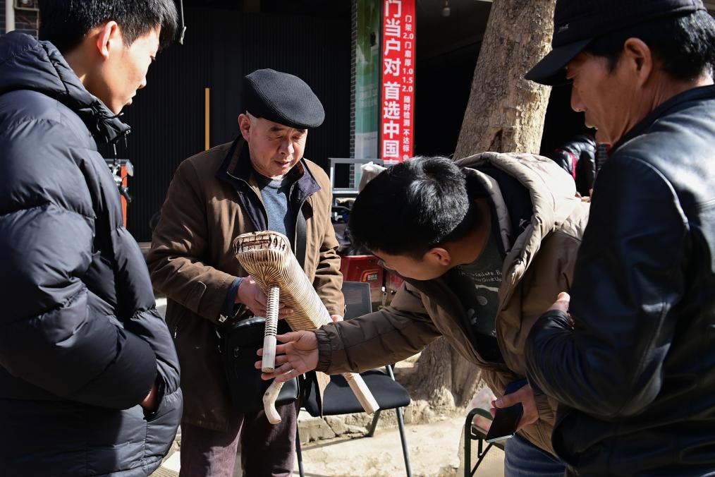 2月13日,当地手工艺人李学员(左二)在焦岱大集上向顾客介绍自制的手工凳子。