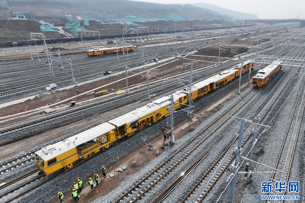 2月26日,大型养路机械在西安东站站场线路上作业(无人机照片)。