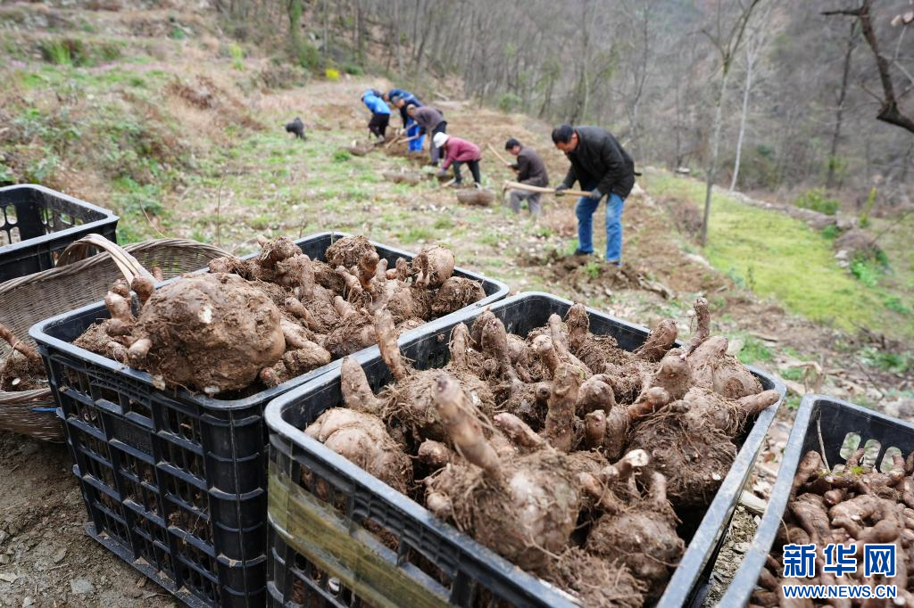 3月3日,陕西省旬阳市段家河镇弥陀寺村村民在村上的产业园中收魔芋。新华社记者 邵瑞 摄