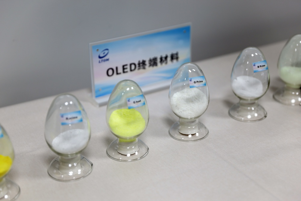 陕西莱特光电材料股份有限公司展示的该公司生产的OLED终端材料。新华网 王智超摄