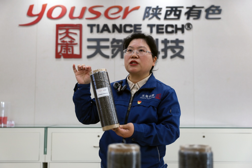 陕西有色天策新材料科技有限公司的工作人员展示公司生产的产品。新华网 王智超摄