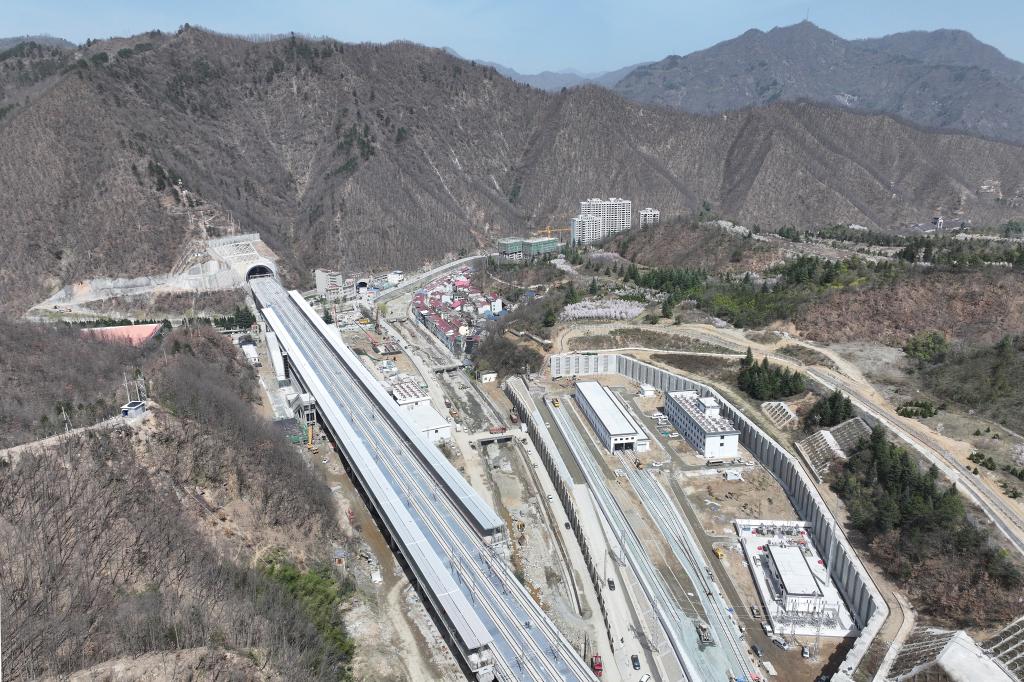 工人在西康高铁秦岭九天山隧道外施工作业(3月20日摄,无人机照片)。