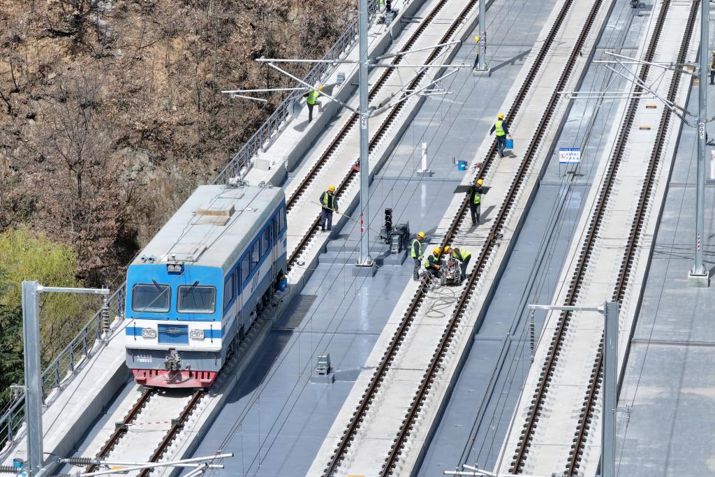 3月20日,工人在柞水西站高铁轨道上施工作业(无人机照片)。