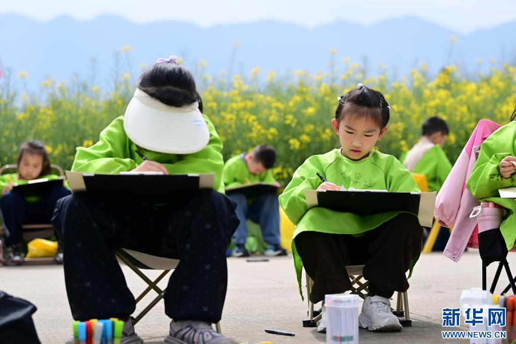 3月28日,学生在汉中市西乡县杨河镇高土坝社区油菜花观花点写生。