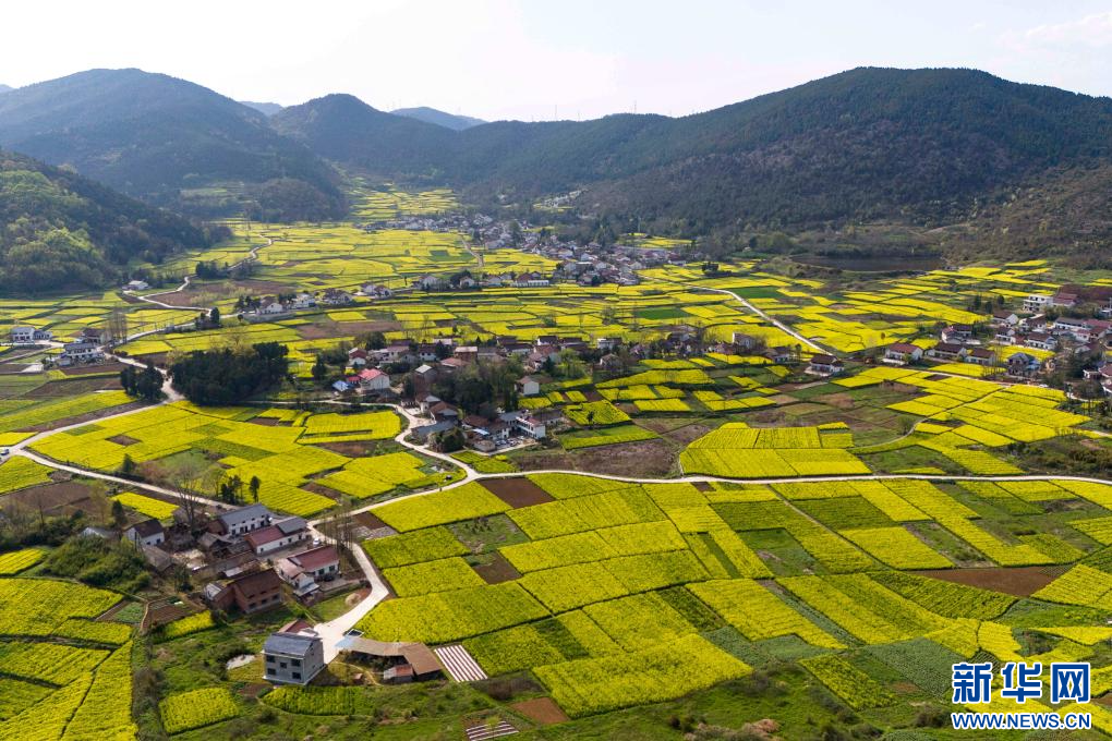 3月28日拍摄的汉中市西乡县城南街道水东村的油菜花海(无人机照片)。